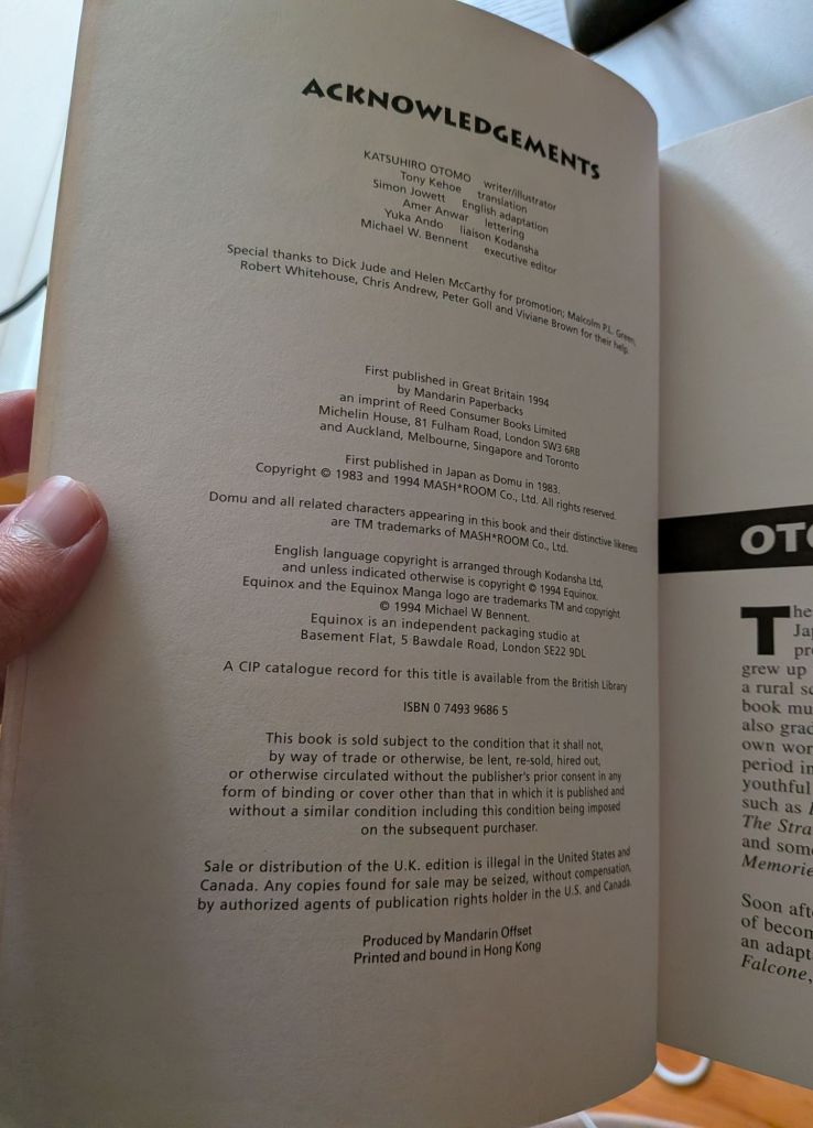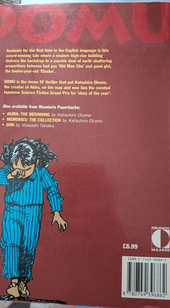 I don’t know if Otomo will ever rerelease Domu in English. I heard fantastic things about the rereleased in Japan (see the halcyonrealms link at the beginning of the article), but in terms of publishing rights outside Japan, I think it’s out of Otomo’s hands. Dark Horse has the rights, according to Wikipedia, as of 2026 the company still exists, so they pretty much just sit on the publishing and republishing rights at this moment.