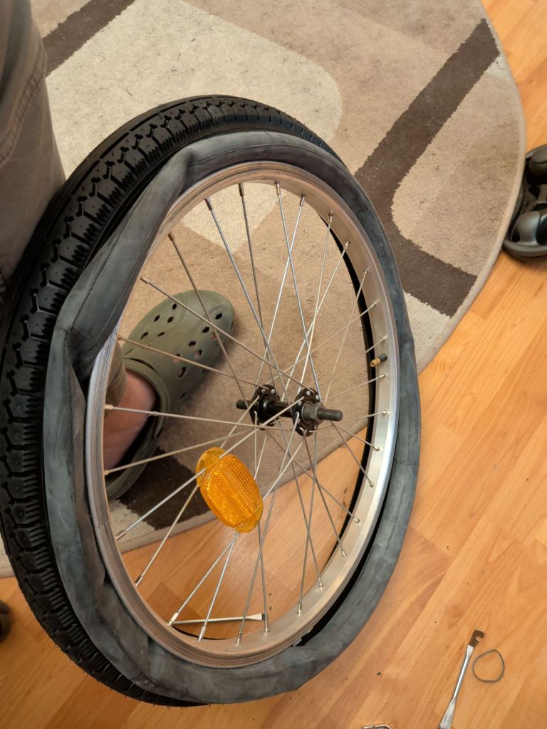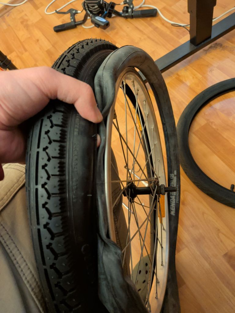 OK, CHANCE OF PLANS. I DON’T CARE IF IT’S WRONG, I CAN’T GET THE DAMN TIRE OVER THE TUBE, I’M DOING IT MY WAY. Tube in tire, pair over rim.