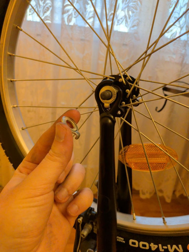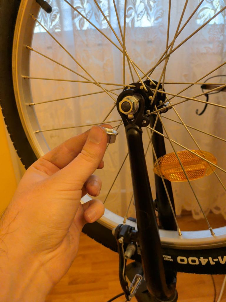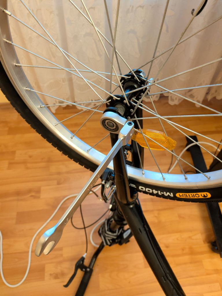 Well, I took the front wheel off, cleaned up the bike, oiled the chain and put air into the back tire. Now I have to wait for the spare parts to arrive so I can finish the job, unless I’m content with riding a unicycle from now on. I haven’t taken pictures of using the wrench, but it’s pretty straightforward, and I’ll make sure to photograph screwing the nut and washer pair on both sides when I reinstall the wheel, which is basically the process in reverse.